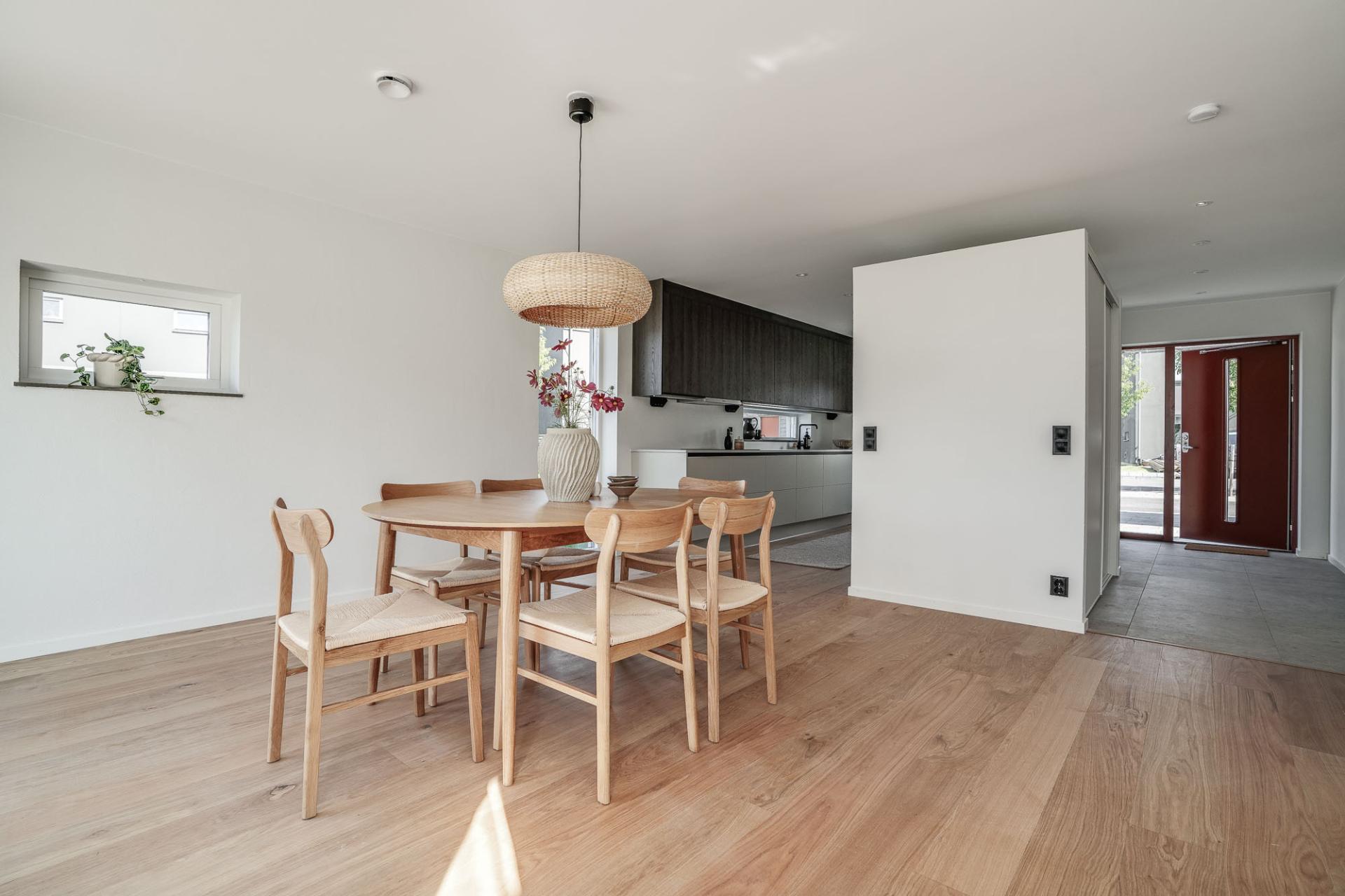 Vidare in i huset öppnar planlösningen upp sig på ett sätt som känns generöst. Vardagsrum och matplats flyter sömlöst samman och ramas in av breda fönsterpartier som suddar ut gränsen mellan inne och ute. Den varma träparketten ger en ombonad känsla under fötterna, och dess naturliga struktur binder samman de olika rummen med en tidlös elegans.
