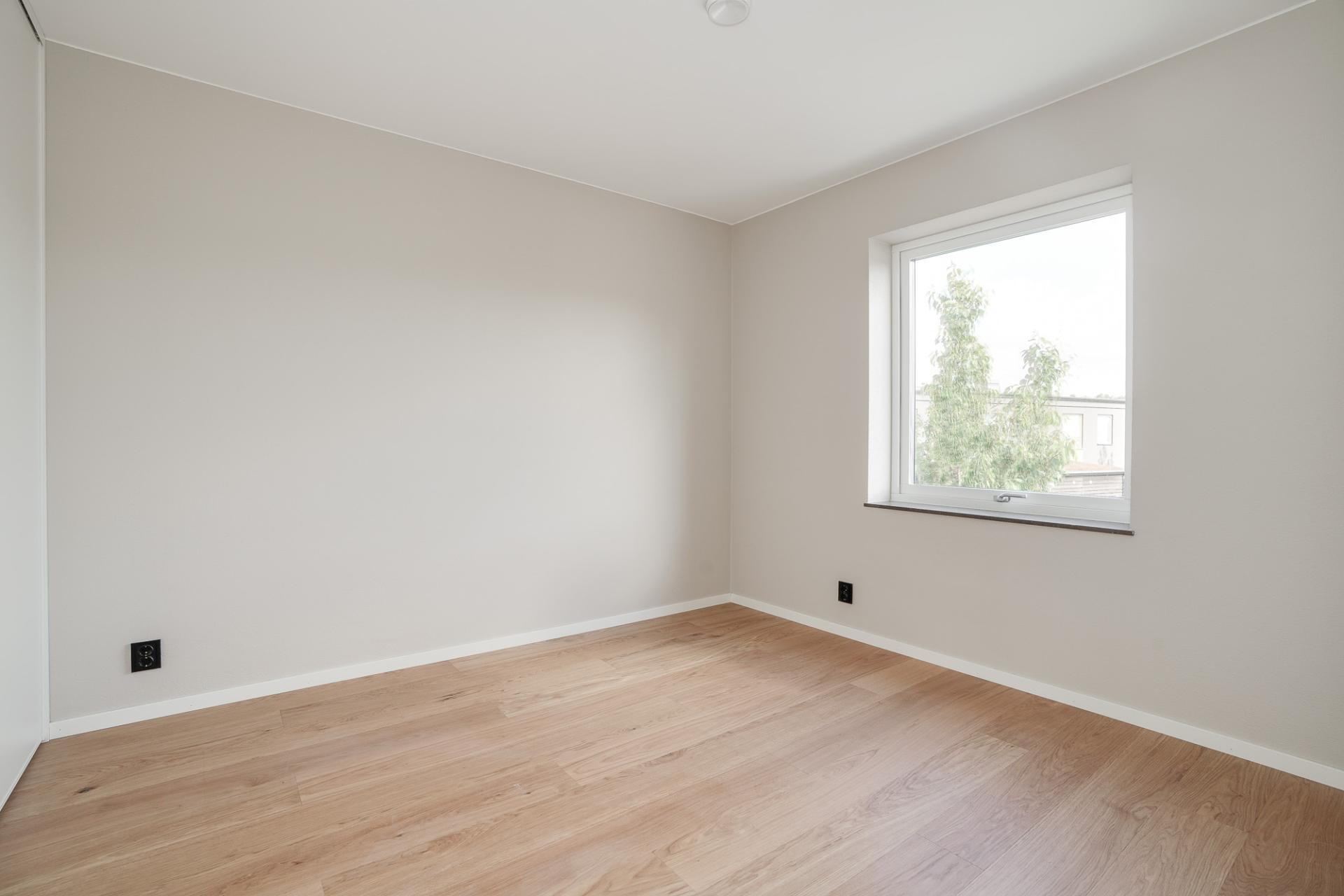 På övre plan finns tre rymliga sovrum med behagliga väggkulörer i varmgrå toner och vackra trägolv. Förvaringslösningar är genomtänkta och diskreta, och varje rum andas ro. Det största sovrummet har fönster i två väderstreck, vilket ger ett vackert ljusspel över dagen och utsikt som förstärker lugnet i rummet. Detta master bedroom har en djup fönsternisch som snabbt säkerligen kommer bli en harmonisk läshörna!