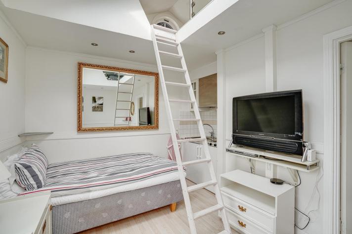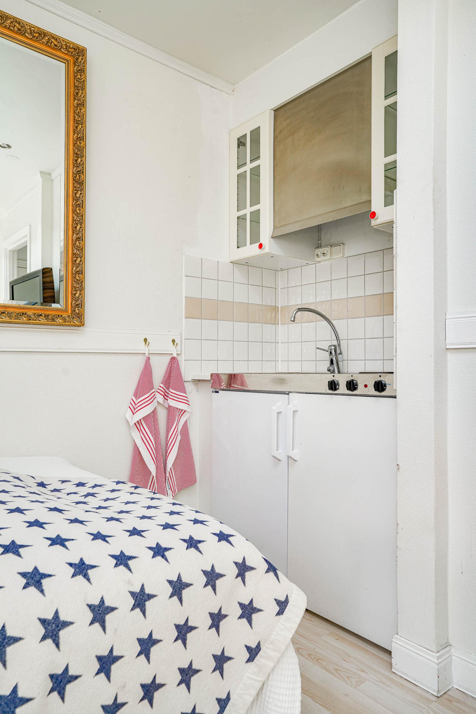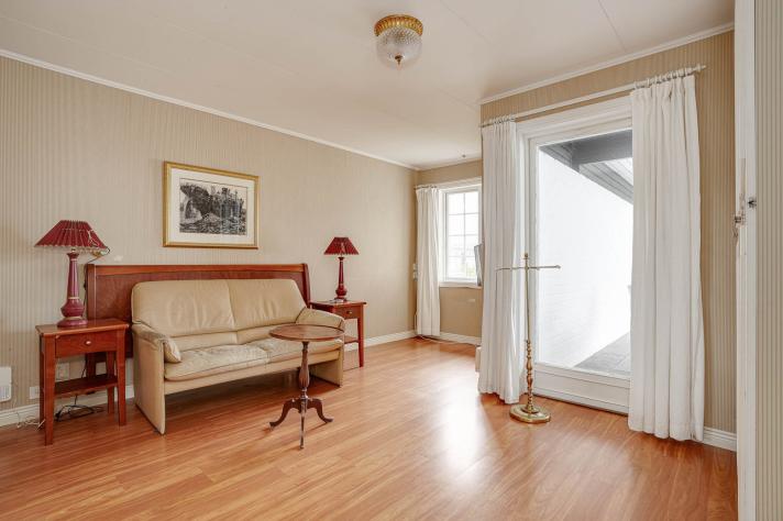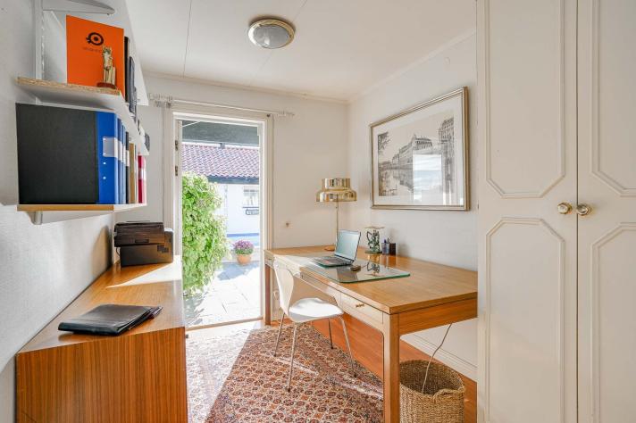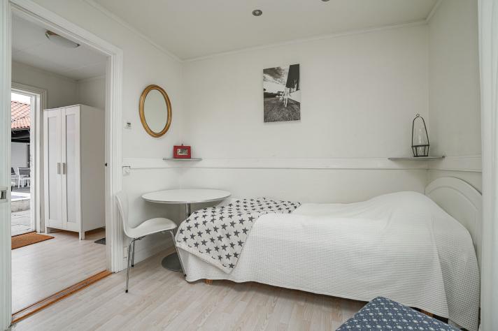 Rummet har vitaliserat laminatgolv och en luftig känsla. Öppet i nock med charmigt loft och en utgång till en separat uteplats i soligt söderläge – en privat plats för morgonkaffet eller kvällens stilla stund.