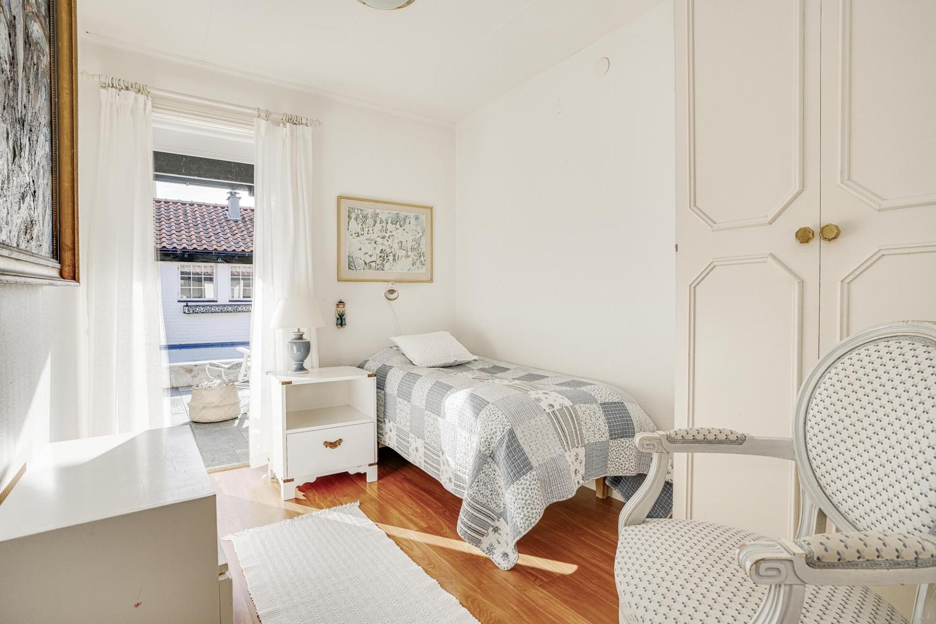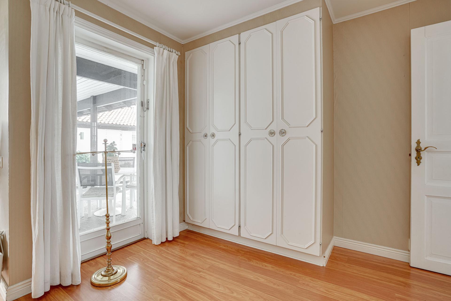 Sovrumsdelen rymmer tre rofyllda rum, samtliga med laminatgolv och separata utgångar ut mot poolområdet. Det större sovrummet längst in i hallen erbjuder generös golvyta och separat ingång till det helkaklade badrummet.