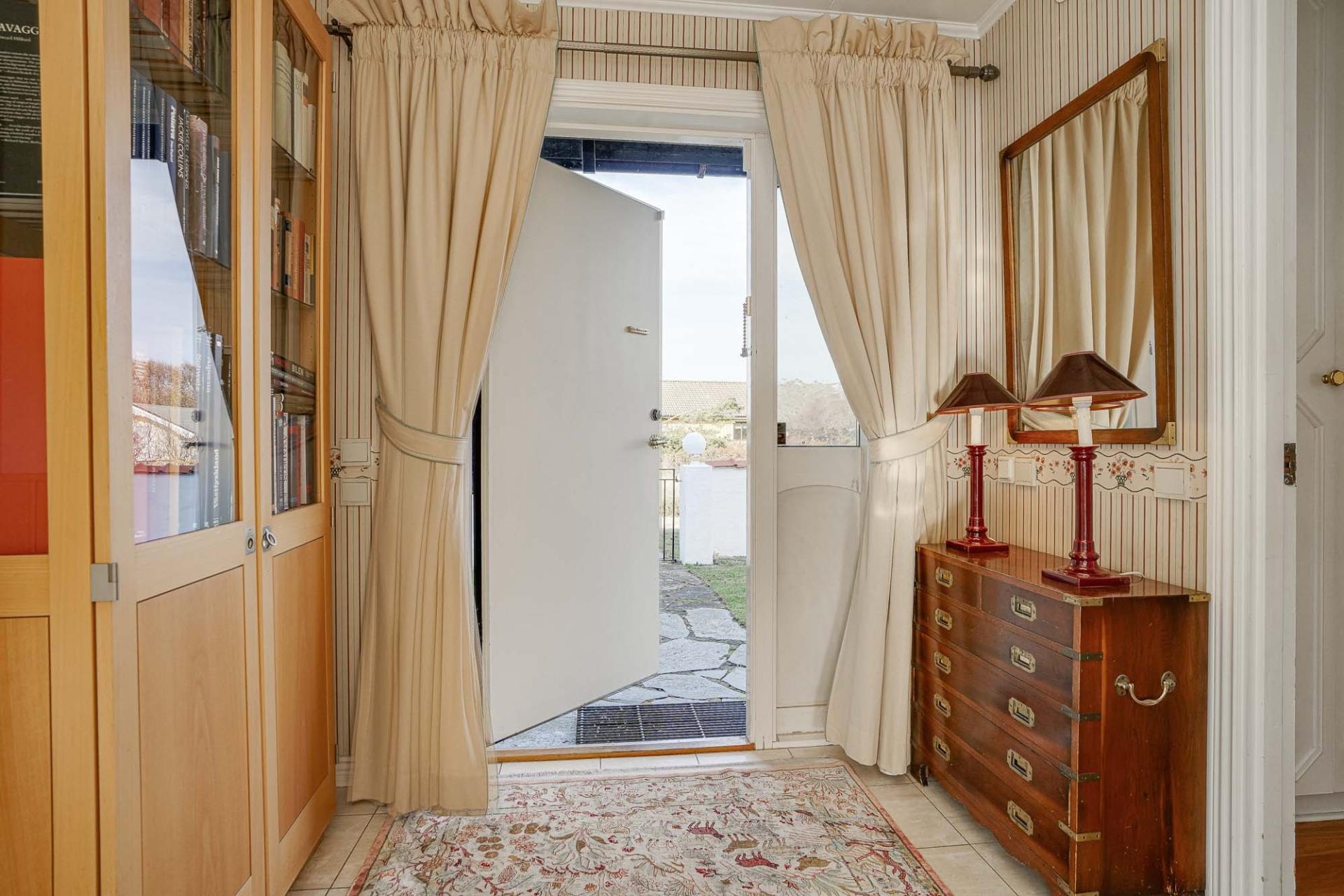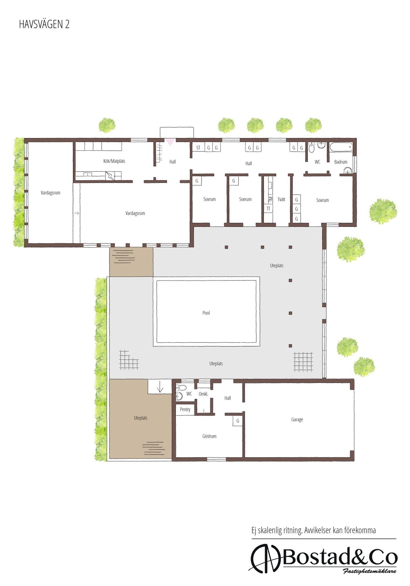 Den kringbyggda planlösningen skapar en naturlig innergårdskänsla, skyddad från vind men öppen mot ljuset. Härifrån nås både huvudhuset, den separata gästavdelningen och det större enbilsgaraget, som erbjuder gott om plats för bil, cyklar och förvaring – perfekt för det aktiva kustlivet.