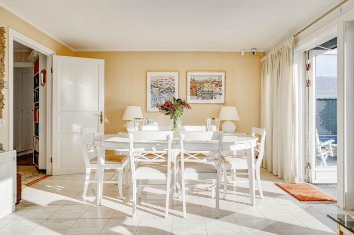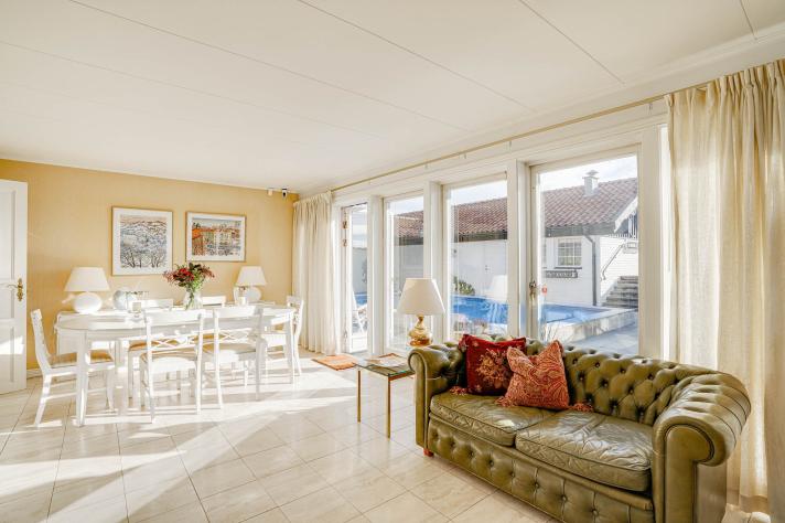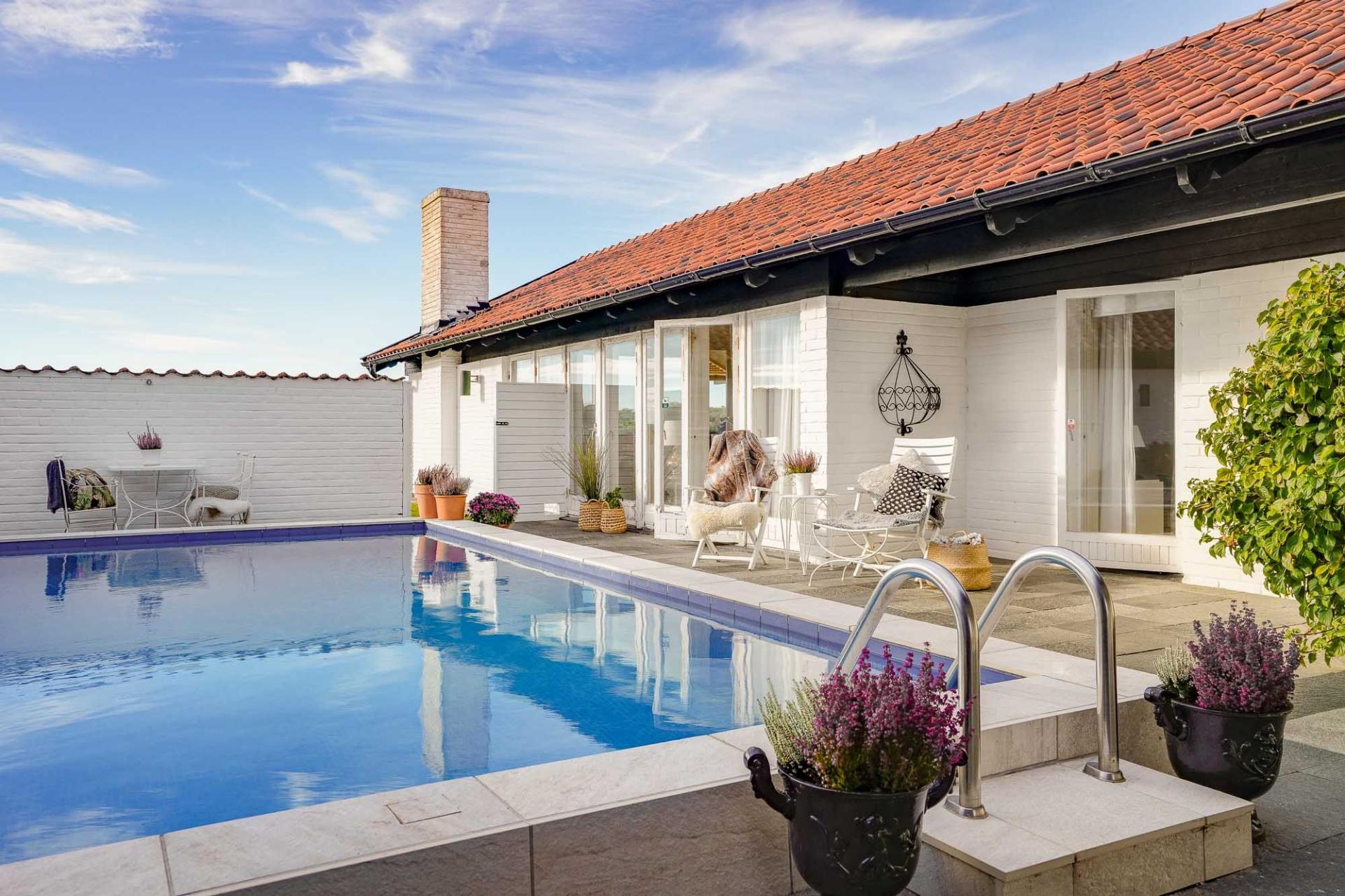 Bakom den vitputsade fasaden döljer sig ett hem där varje kvadratmeter är smart planerade för att skapa ljus, trivsel och funktion. Huvudhusets öppna planlösning och generösa fönsterpartier låter havet och himlen spegla sig i interiören, medan skjutdörrar suddar ut gränsen mellan ute och inne. Den centrala poolgården blir hemmets hjärta – en privat oas där familj och vänner samlas för bad, måltider och stilla stunder i solen.