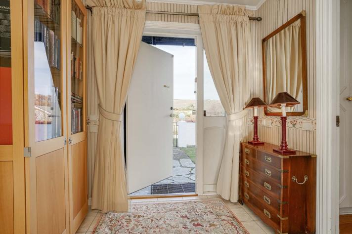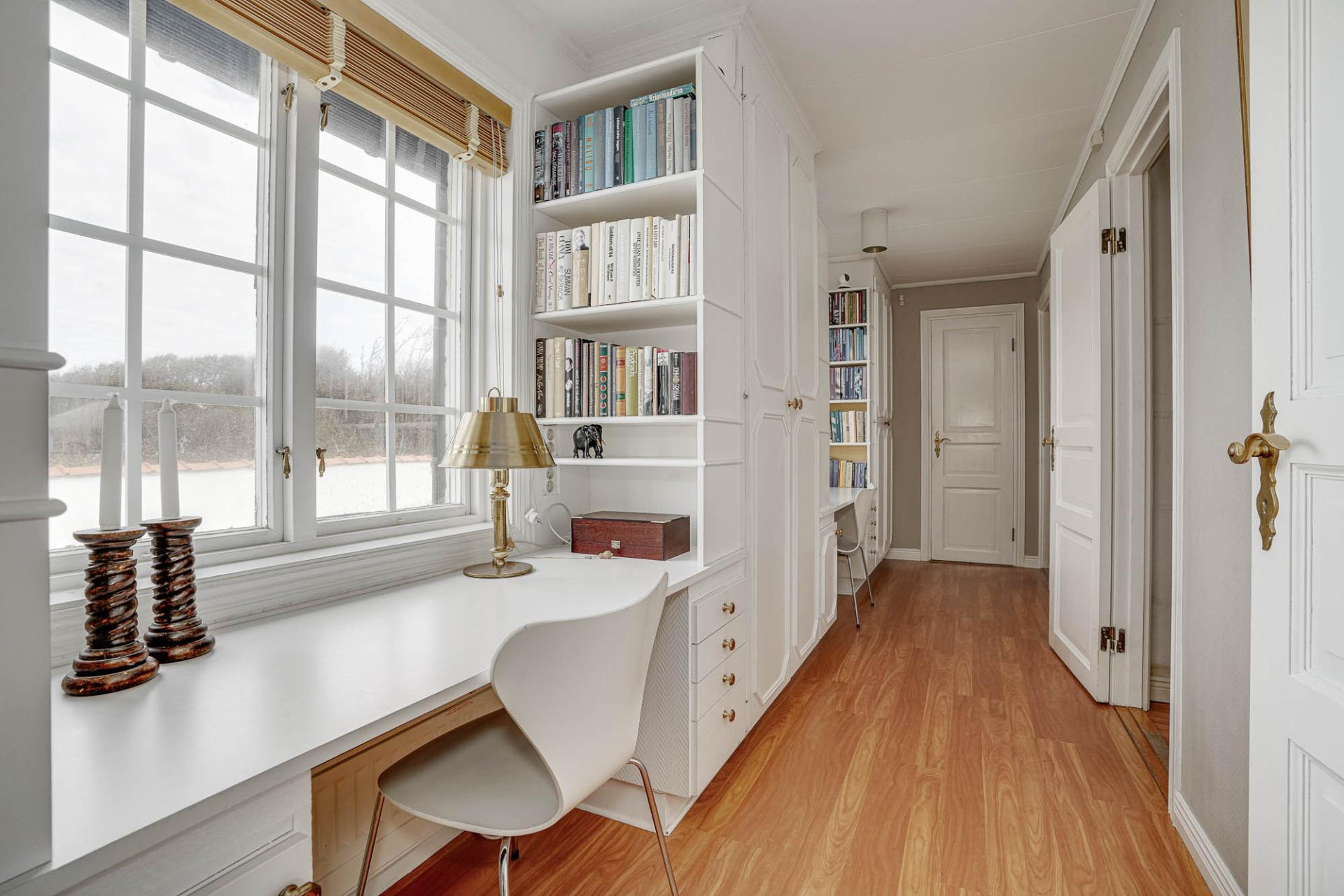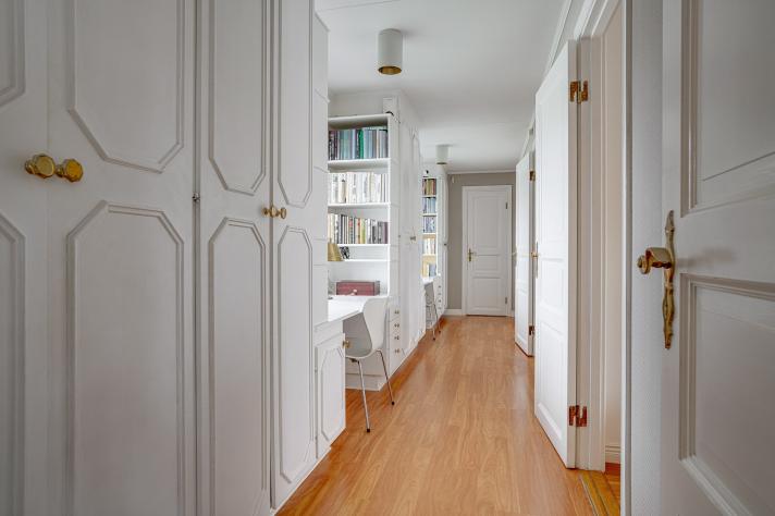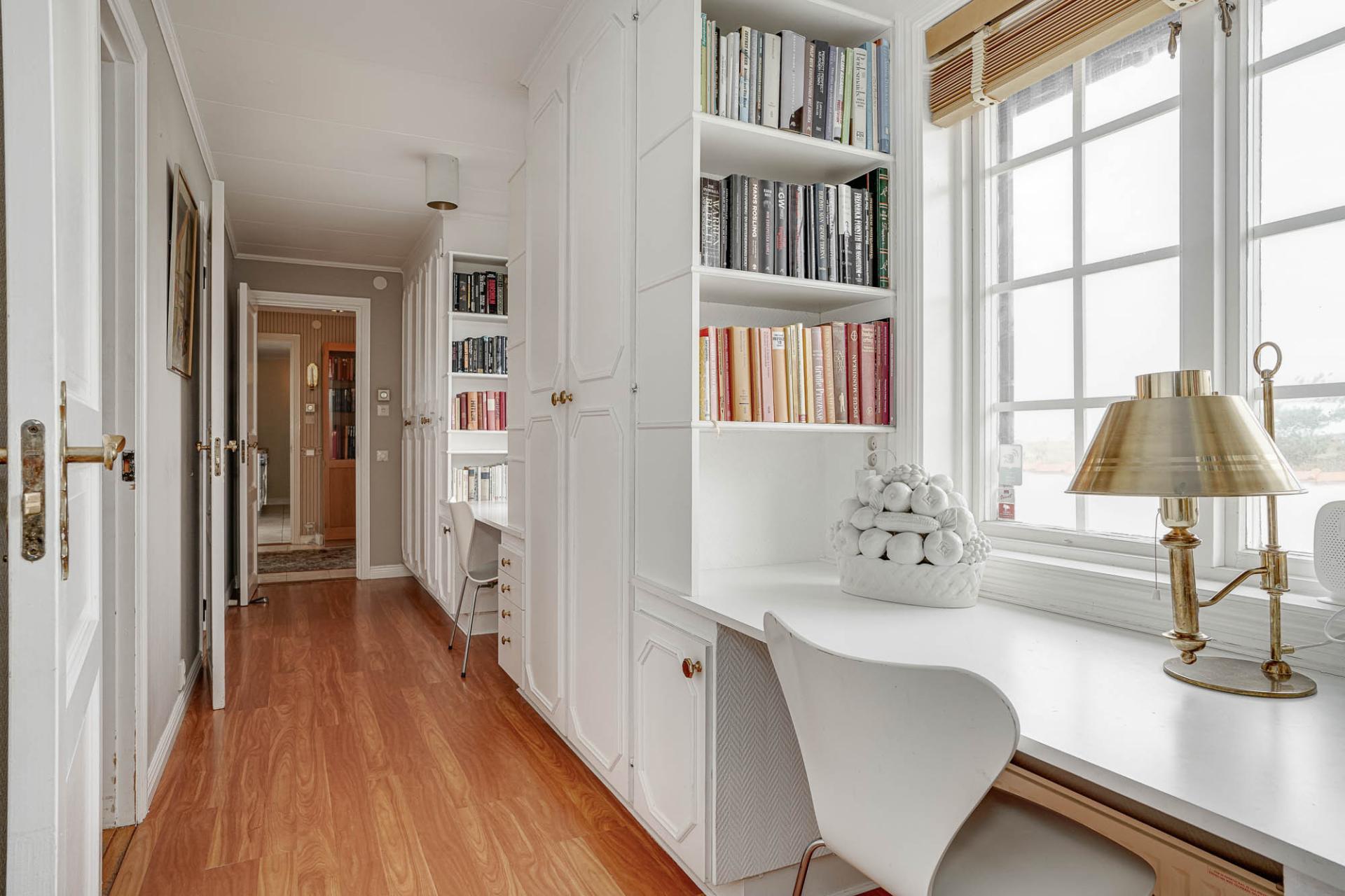 I hallen finns platsbyggda garderobersom ger utmärkt förvaring, och längs de två stora fönsterpartierna har man skapat två ljusa kontorsplatser,– en idealisk lösning för den som arbetar hemifrån i inspirerande miljö.