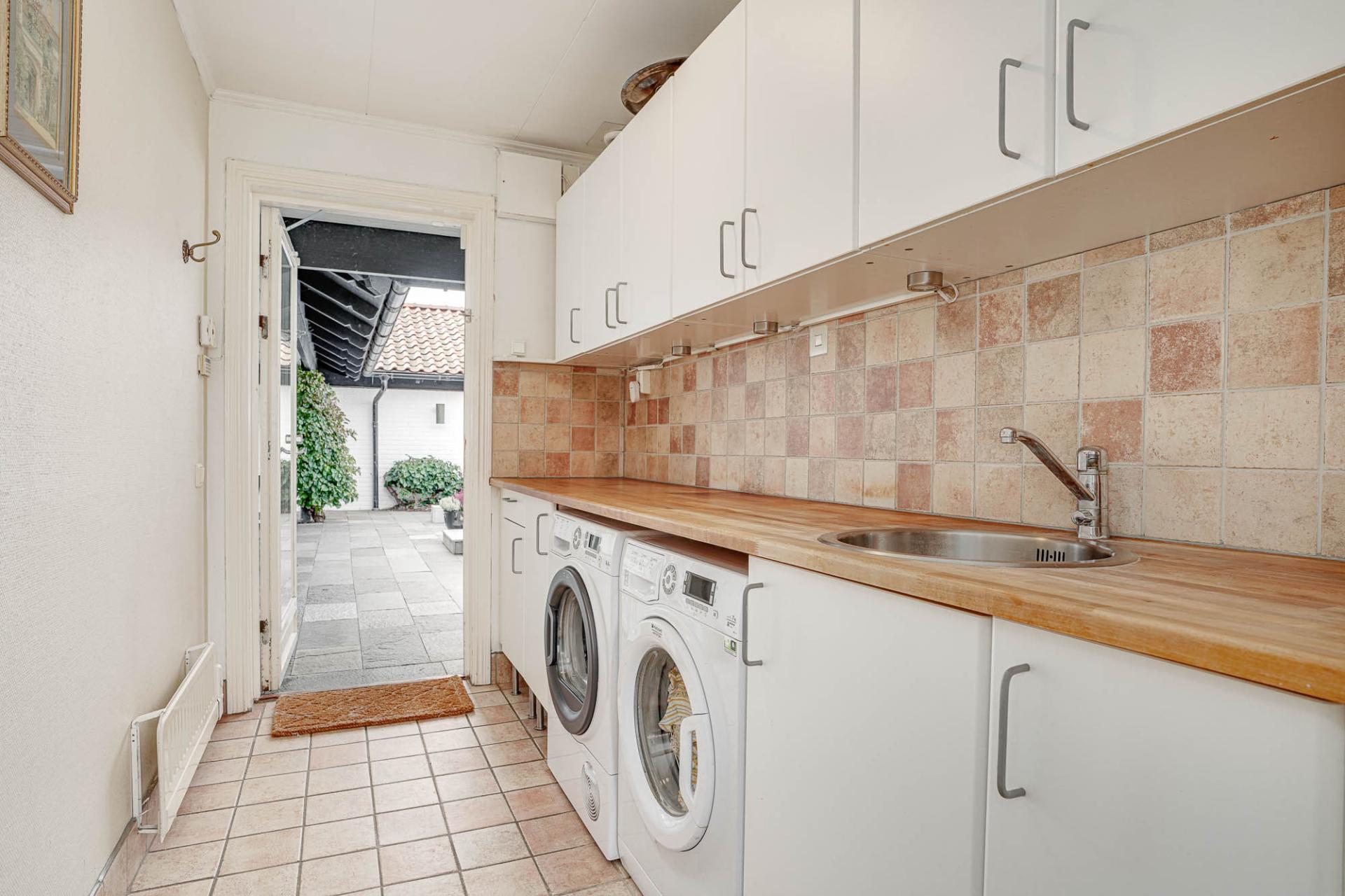 Tvättstugan med direkt utgång mot poolgården, är praktiskt utformad med gott om skåpförvaring, lång arbetsbänk i trä, ho samt tvättmaskin och torktumlare. Kaklat stänkskydd, klinkergolv och separat ingång gör den perfekt efter stranddagar med bad och sand.