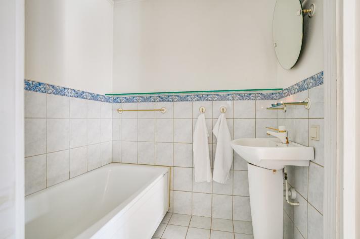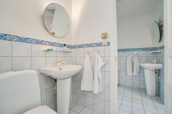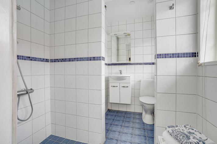 Badrummet är helkaklat i ljusa toner, dusch, wc och kommod – ett fräscht och bekvämt utrymme för gäster eller familj.