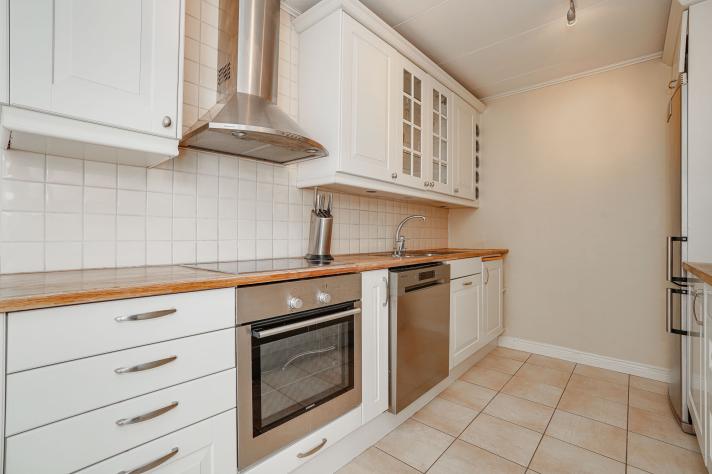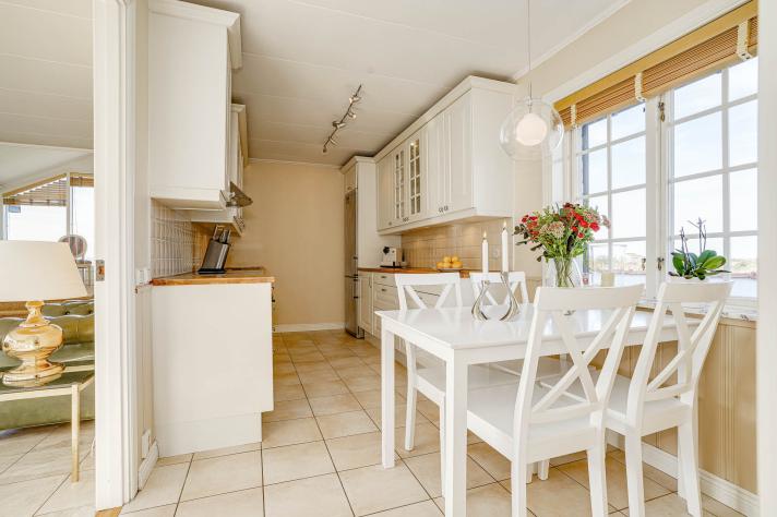 Det trivsamma köket är inrett i ljusa toner med klassiska snickerier, kaklat stänkskydd och arbetsytor i trä. Här finns plats för matbord vid fönstret och nära kontakt med husets sociala ytor.