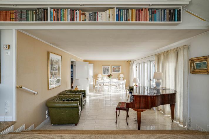 LÄS MER OM HUR 3D-VIEW FUNGERAR HÄRVardagsrum och matplats flyter samman i en öppen, social yta där stora fönsterpartier och skjutdörrar vetter mot poolområdet – här suddas gränsen mellan inne och ute bort. En halv trappa upp öppnar rummet upp sig mot havet, där fönsterväggen ramar in utsikten över sanddyner och horisont som en levande tavla.
