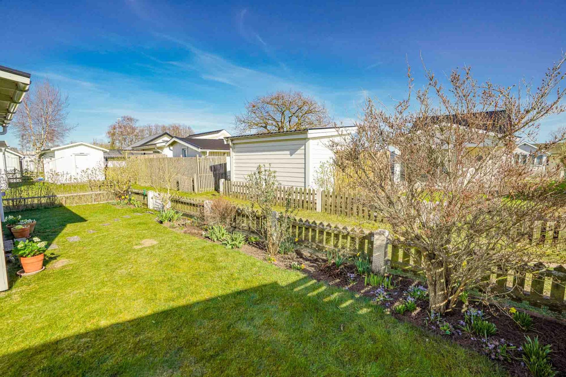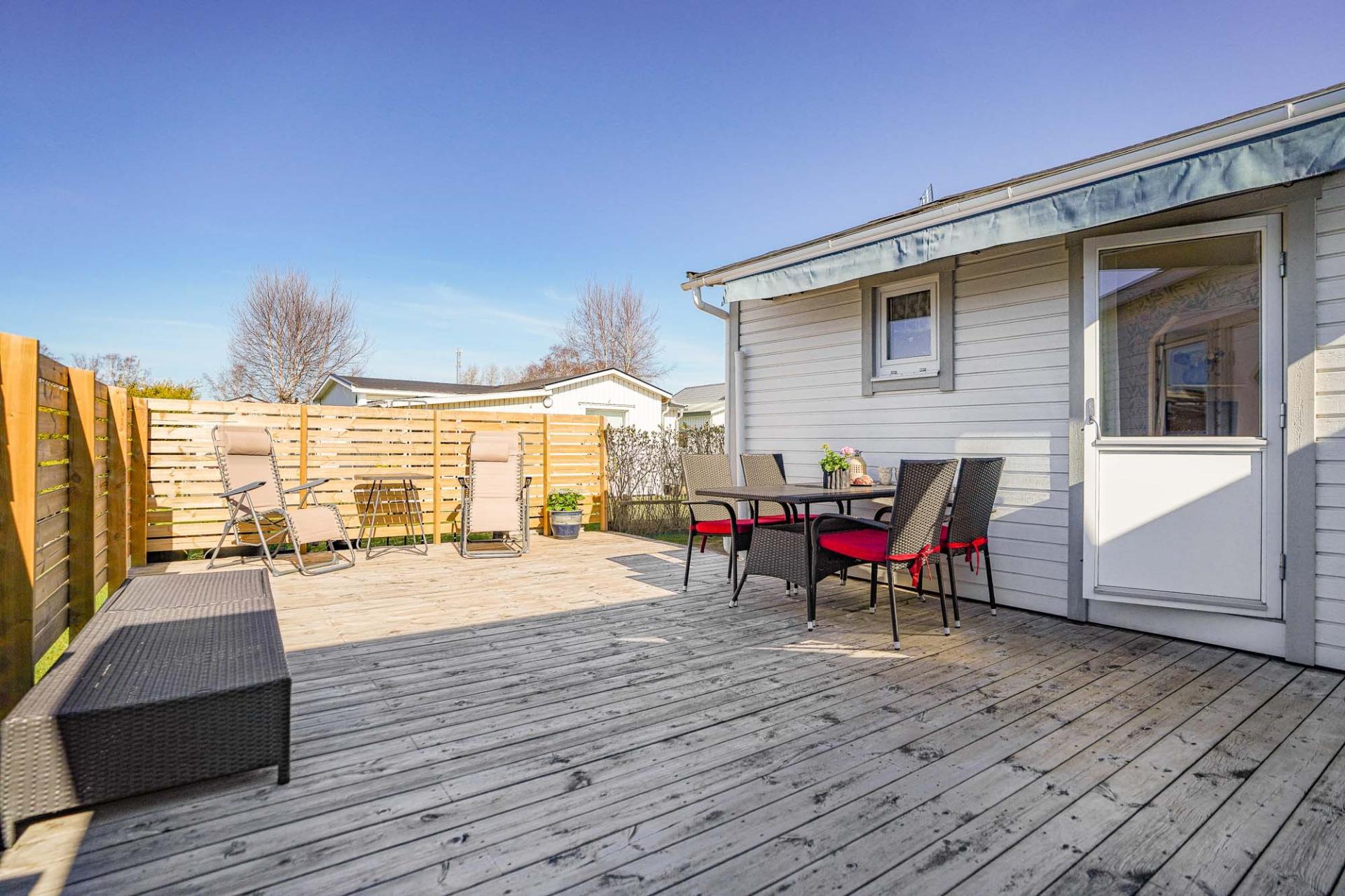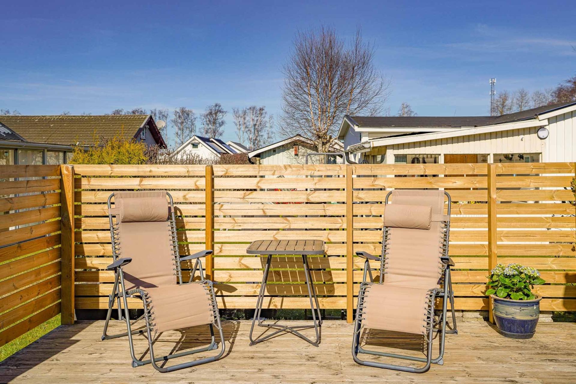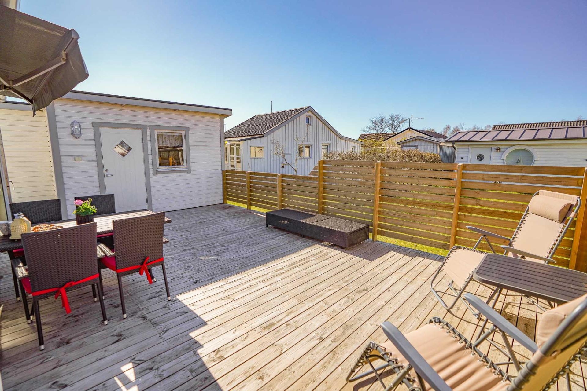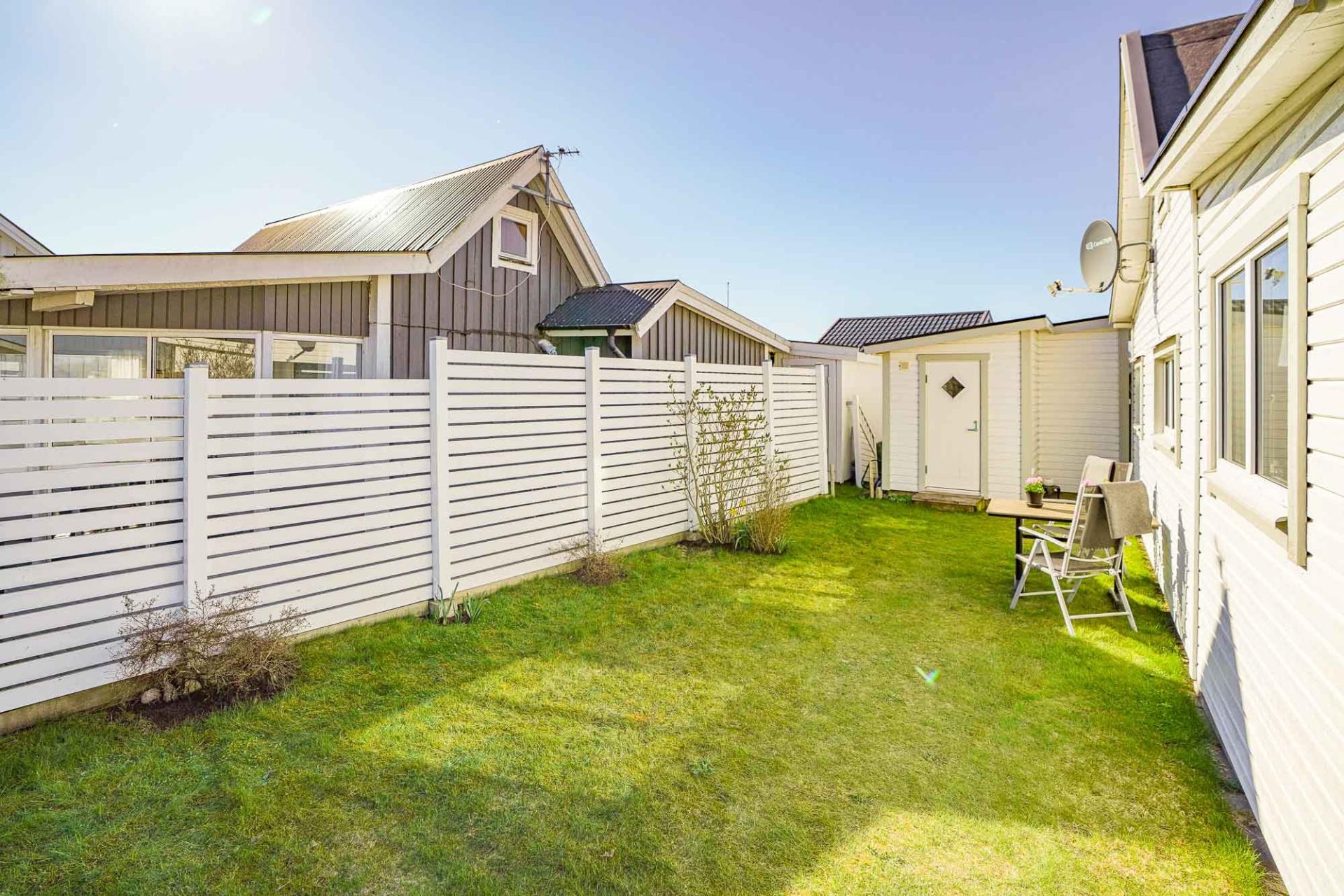 På tomten finns en generös uteplats som inbjuder till härliga dagar i solen med långa, ljumna sommarkvällar. Delar av tomten är avskärmad och erbjuder både vind- och insynsskydd vilket skapar en privat och rofylld miljö att njuta av. Den lättskötta trädgården ger gott om utrymme för lek, avkoppling och sociala stunder.