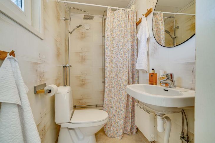 Badrummet är funktionellt utrustat med duschhörna, wc och handfat. Ytskikten består av våtrumsmatta på golvet och våtrumstapet på väggarna, vilket ger ett lättskött och praktiskt utrymme.