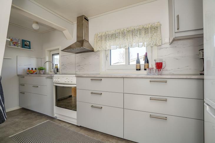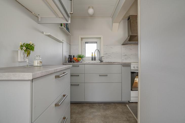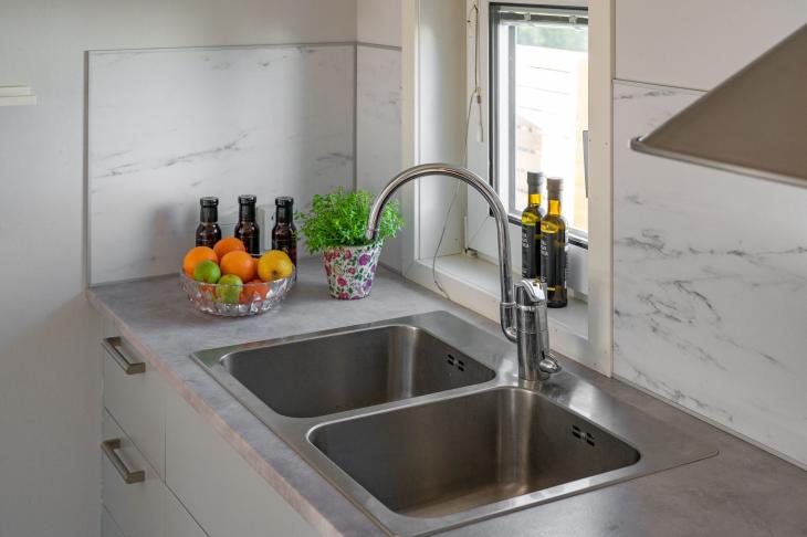 LÄS MER OM HUR 3D-VIEW FUNGERAR HÄRKöket är modernt och praktiskt utformat med goda arbetsytor och förvaring. Här finns kyl/frys, spishäll med ugn, spisfläkt samt rostfri ho. Golvet är belagt med ett slitstarkt grått linoleumgolv som både är lättskött och tåligt – perfekt för ett bekvämt fritidsboende. Här finns även en golvlucka till en mindre förvaringsyta placerad under golvytan.