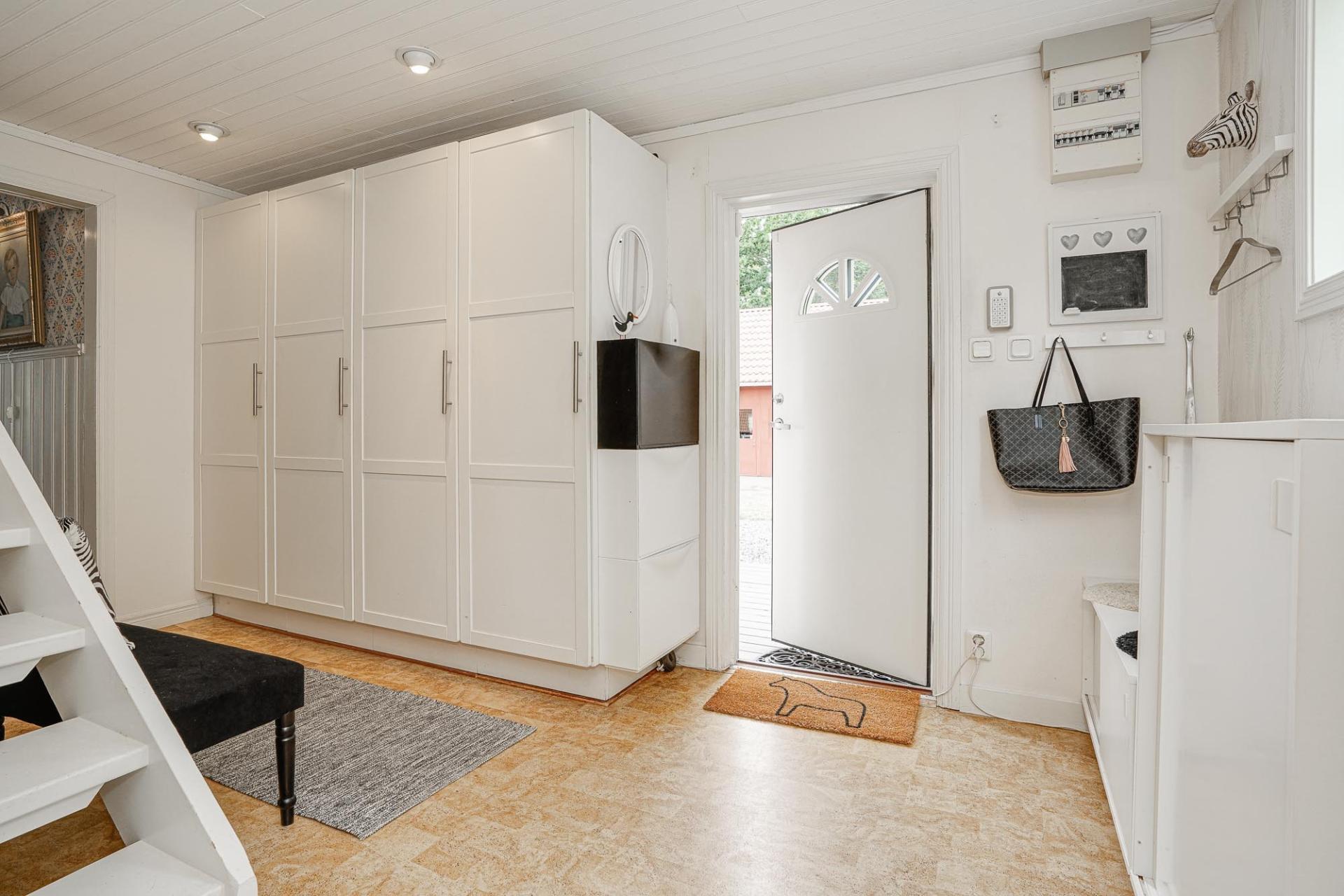 Du välkomnas in i en rymlig och inbjudande hall med praktisk plastmatta på golvet – ett slitstarkt och lättskött val. Här finns gott om förvaring samt bra avhängningsmöjligheter för ytterkläder och skor.