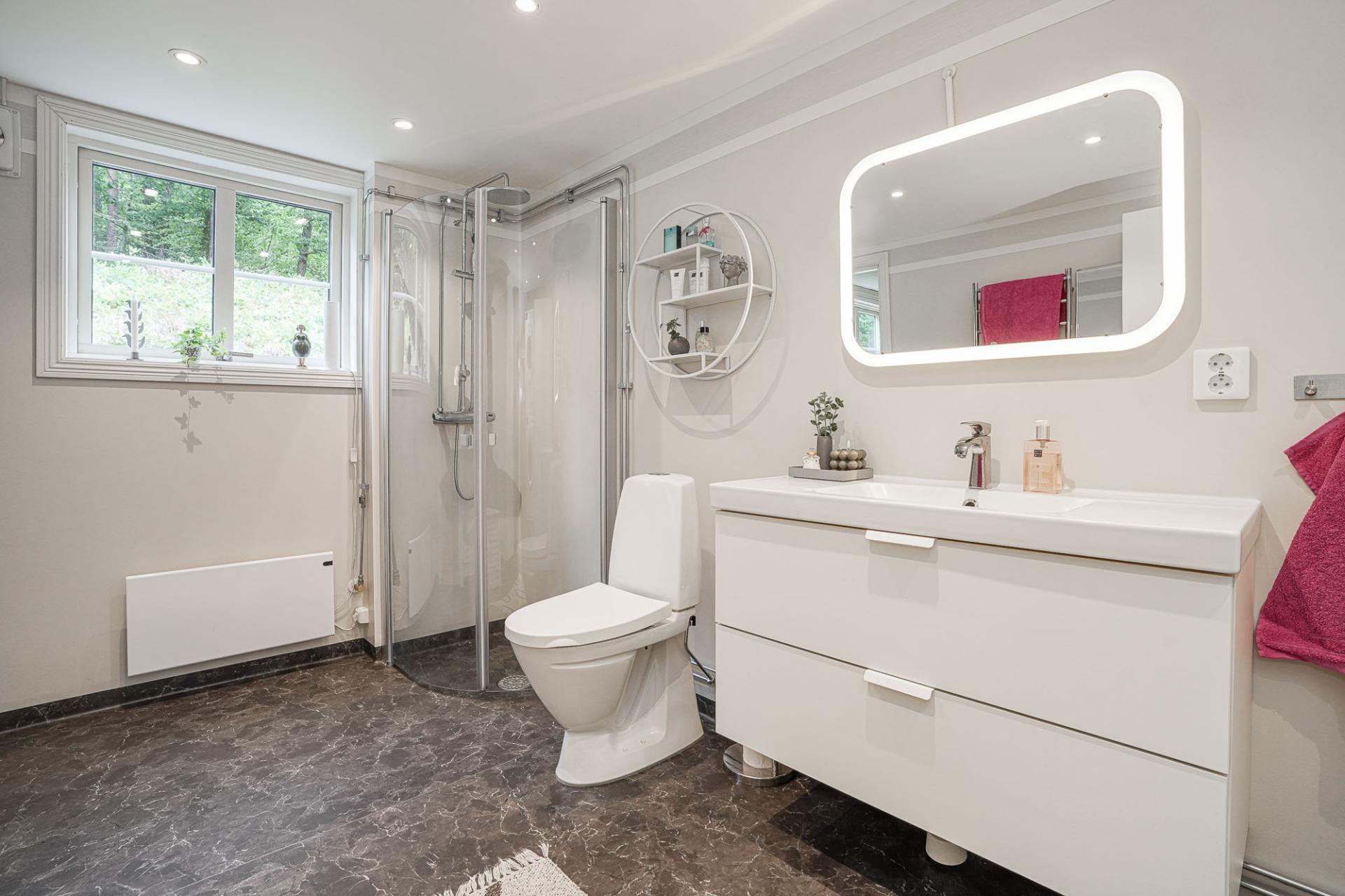 Från entrén nås ett fräscht badrum med våtrumsmatta på både golv och väggar samt golvvärme för extra komfort. Badrummet är utrustat med dusch med glasdörrar, WC, handfat och förvaringsskåp. Här finns även tvättmaskin och torktumlare (båda från 2018) samt infällda spotlights i taket.