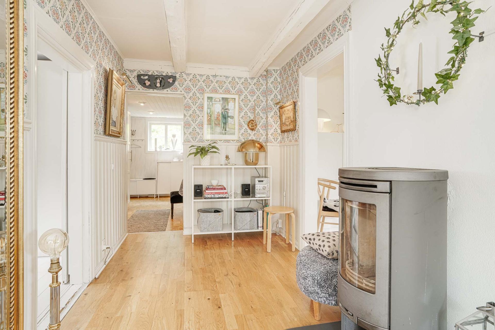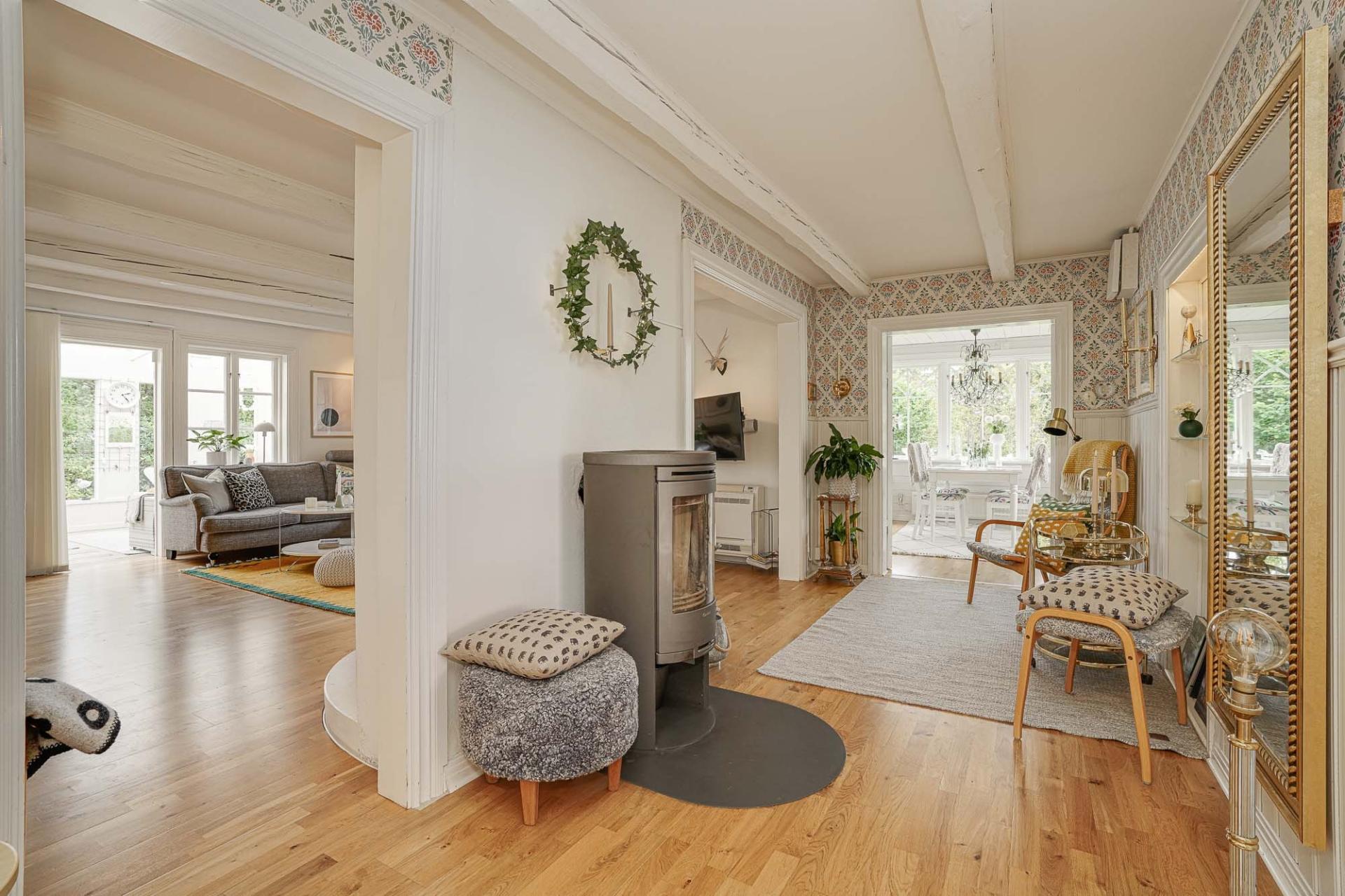 Ett stort och härligt vardagsrum där en murstock med dubbla eldstäder fungerar som en naturlig rumsavdelare. Eldstäderna bidrar både med effektiv uppvärmning och hög mysfaktor. Vackra takbjälkar ger rummet karaktär och på golvet ligger parkett. Härifrån nås uterummet och uteplatsen.