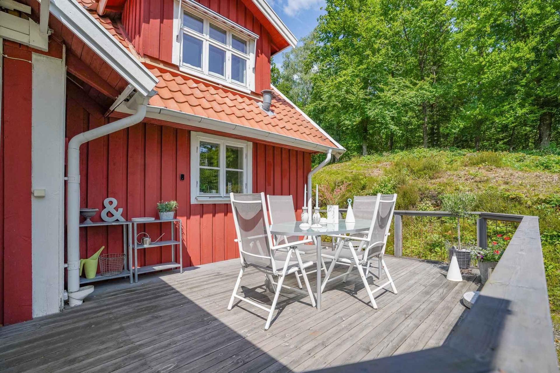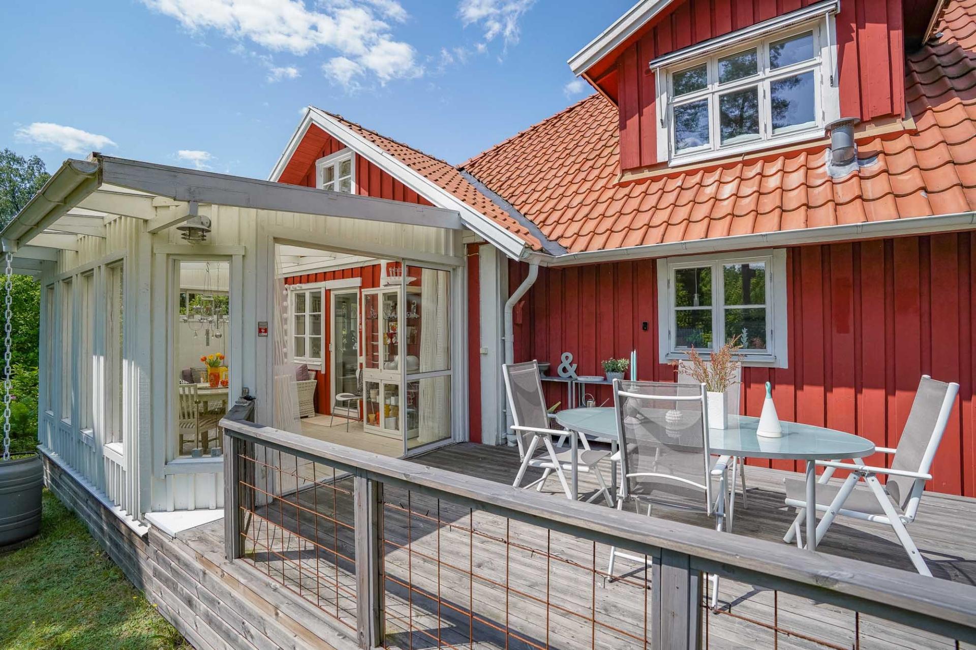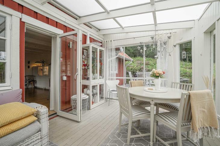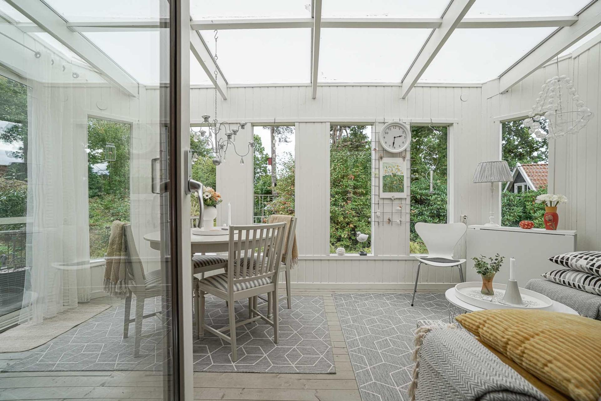Den inglasade verandan om cirka 15 kvm förlänger sommarsäsongen och bjuder in till frukostar i morgonsolen eller lugna kvällar ackompanjerade av naturens ljud. Härifrån nås även den öppna uteplatsen – en plats att verkligen trivas på.