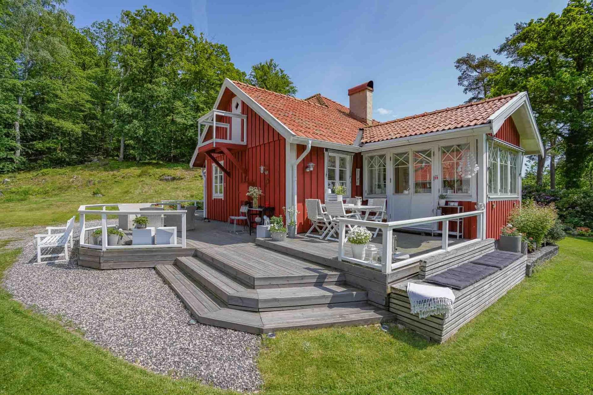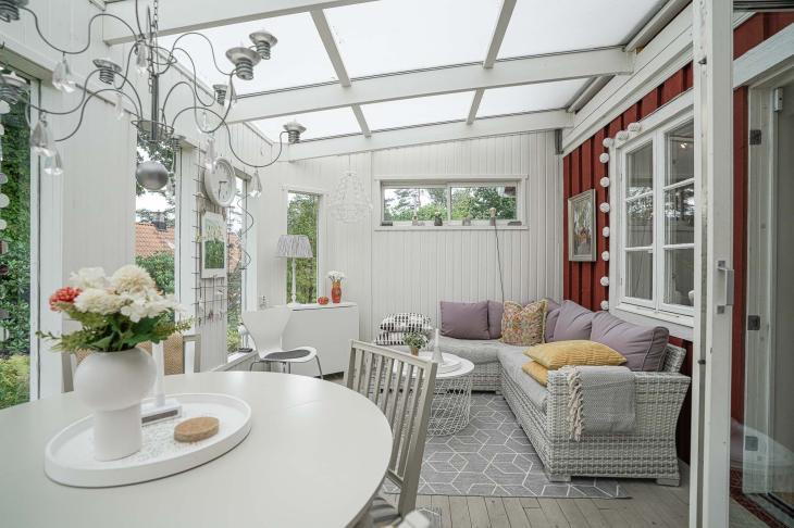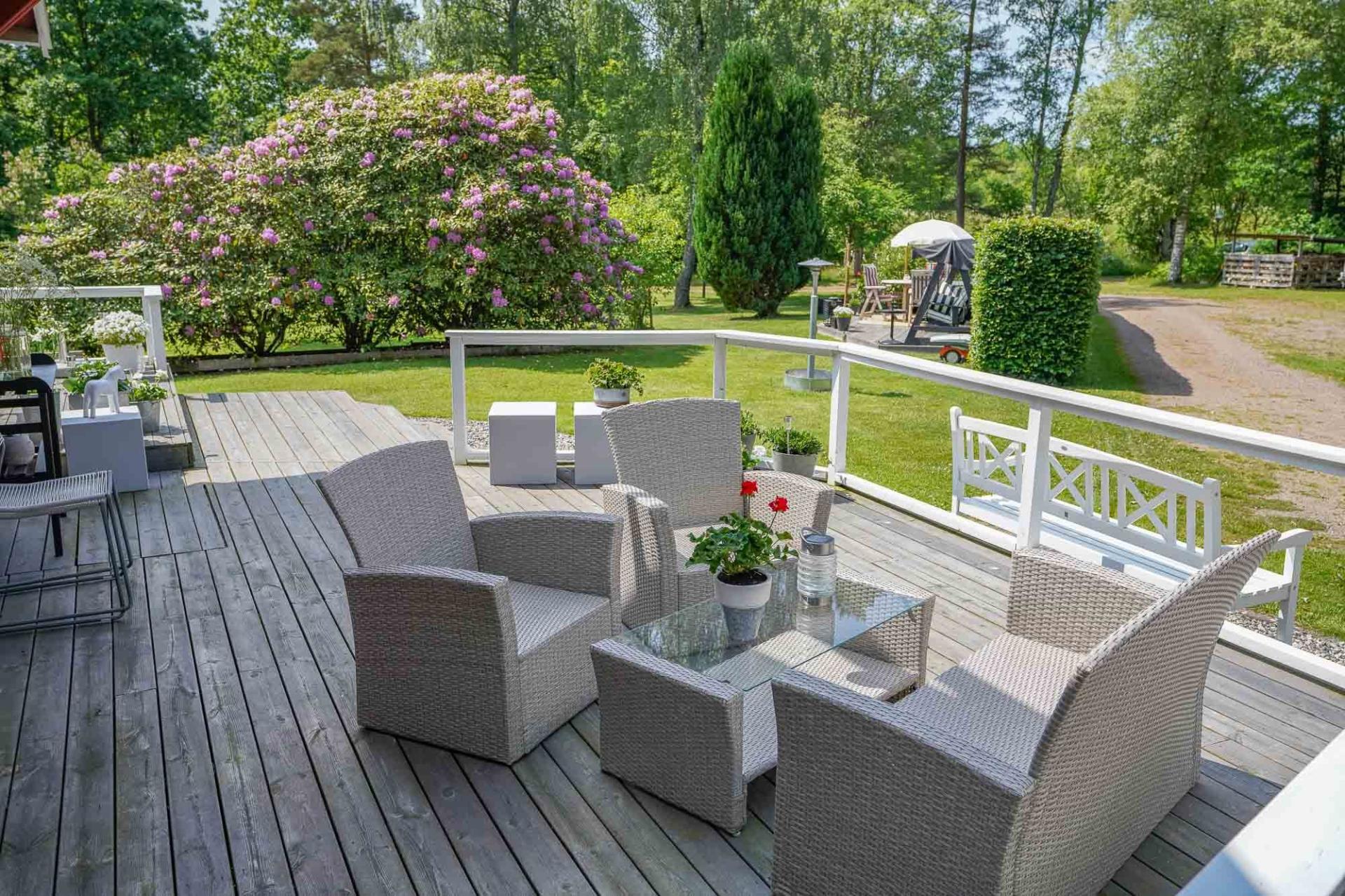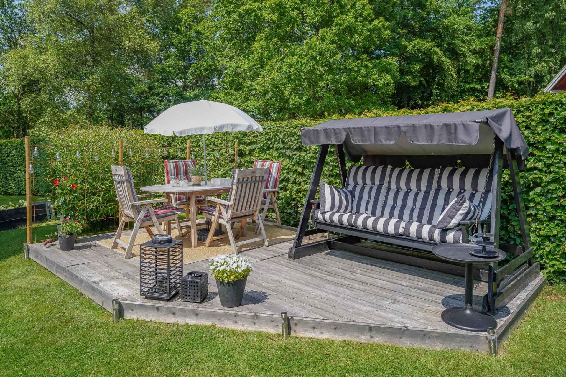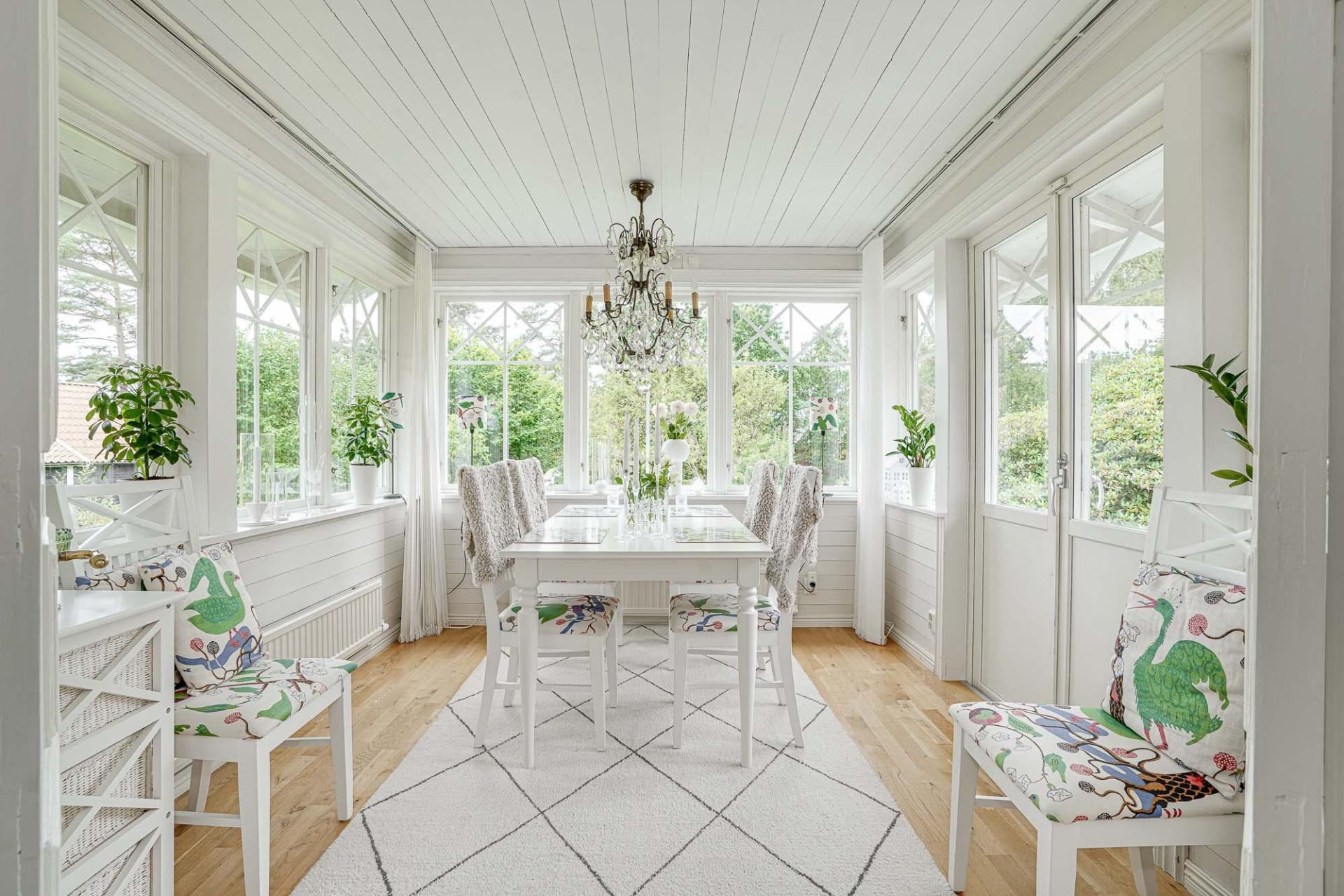 Den inglasade verandan om cirka 15 kvm förlänger sommarsäsongen och bjuder in till frukostar i morgonsolen eller lugna kvällar ackompanjerade av naturens ljud. Härifrån nås även den öppna uteplatsen – en plats att verkligen trivas på.