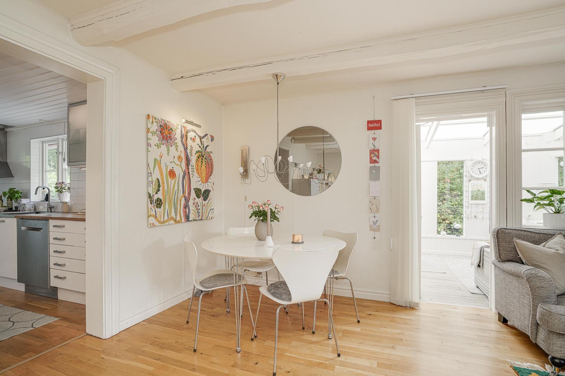 Ett trivsamt rum som snabbt blir en favoritplats för både avkoppling och middagar. Här njuter du av utsikten över trädgården och har utgång till framsidans uteplats.