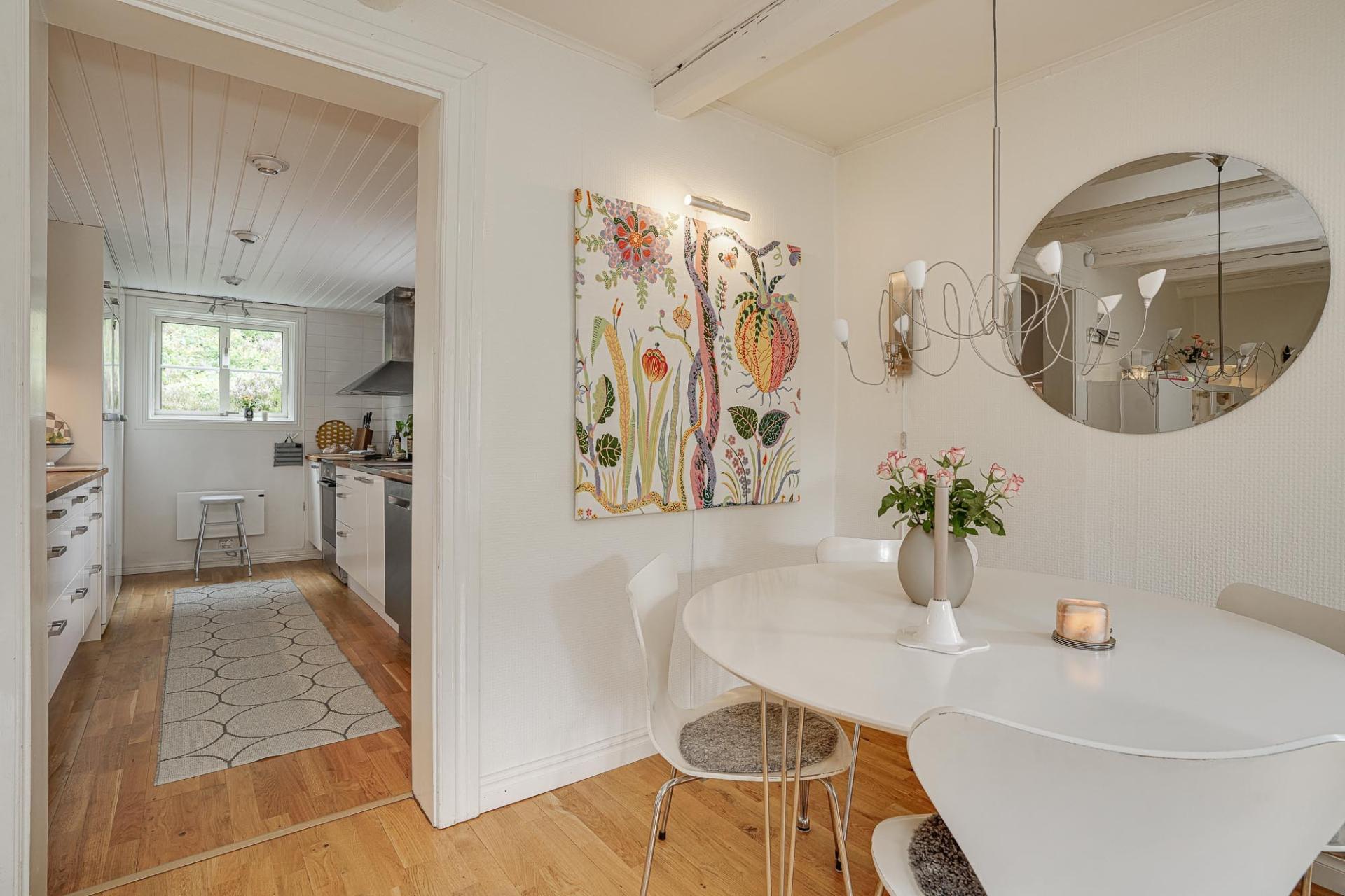 Köket är välplanerat och utrustat med kvalitativa vitvaror, med gott om arbetsytor och förvaring – en naturlig samlingsplats för både vardag och fest. Bostaden erbjuder även 2–3 rogivande sovrum samt ett stilfullt badrum med integrerad tvättdel.