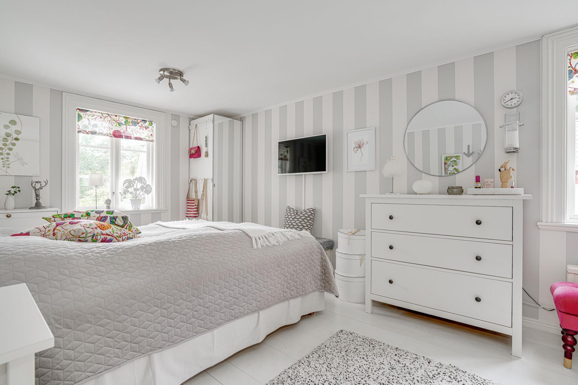 Rymligt och rogivande sovrum som tidigare varit uppdelat i två rum. Vackert målat plankgolv bidrar till en varm och lantlig känsla.