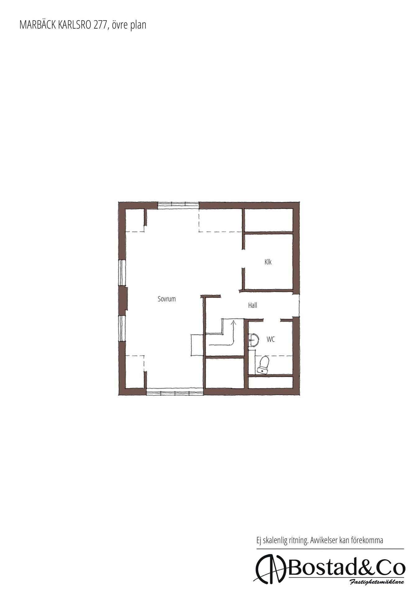 Övre plan med 1-2 sovrum och toalett.