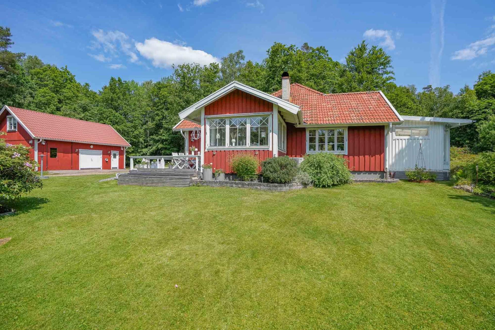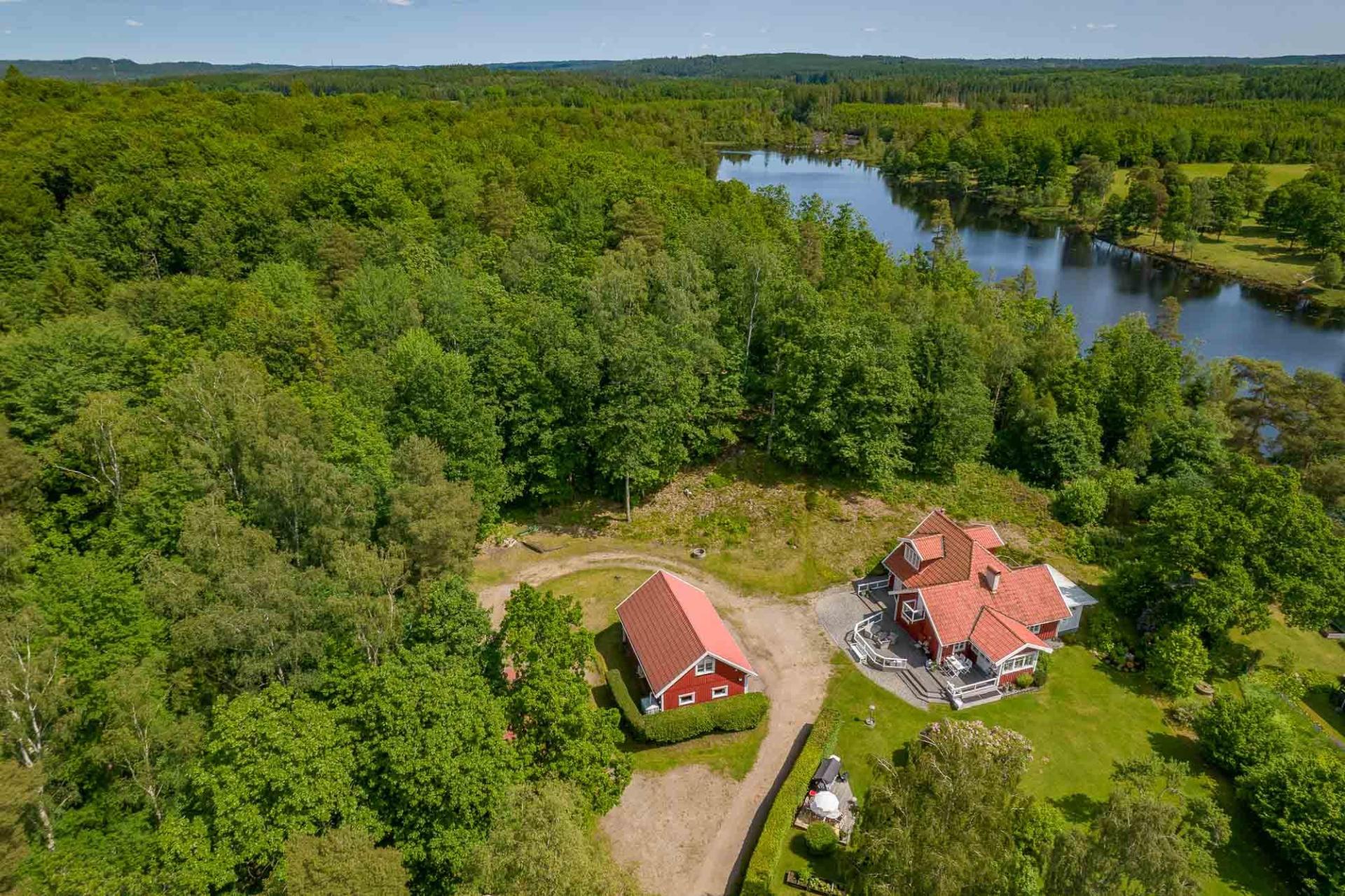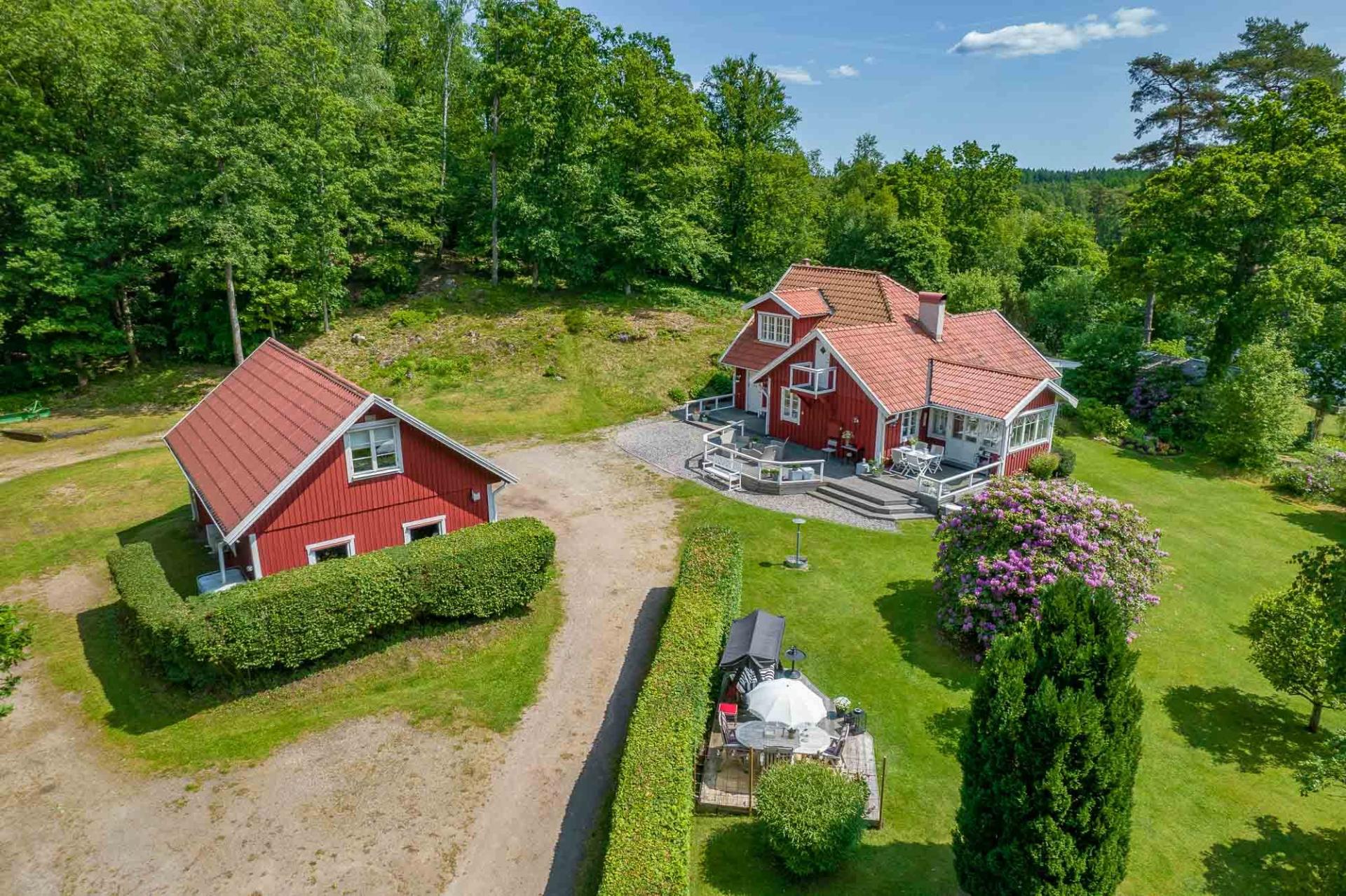 Med ett idylliskt läge nås denna lilla pärla via en stillsam grusväg den sista biten fram till gårdsplanen. Redan här infinner sig den rogivande känslan av att vara långt ifrån vardagens brus. Mitt i denna lummiga oas, omgiven av högrest skog, porlande vatten och ett rikt växt- och djurliv, ligger denna välskötta och charmiga villa med tillhörande ekonomibyggnad, dubbelgarage och förråd.