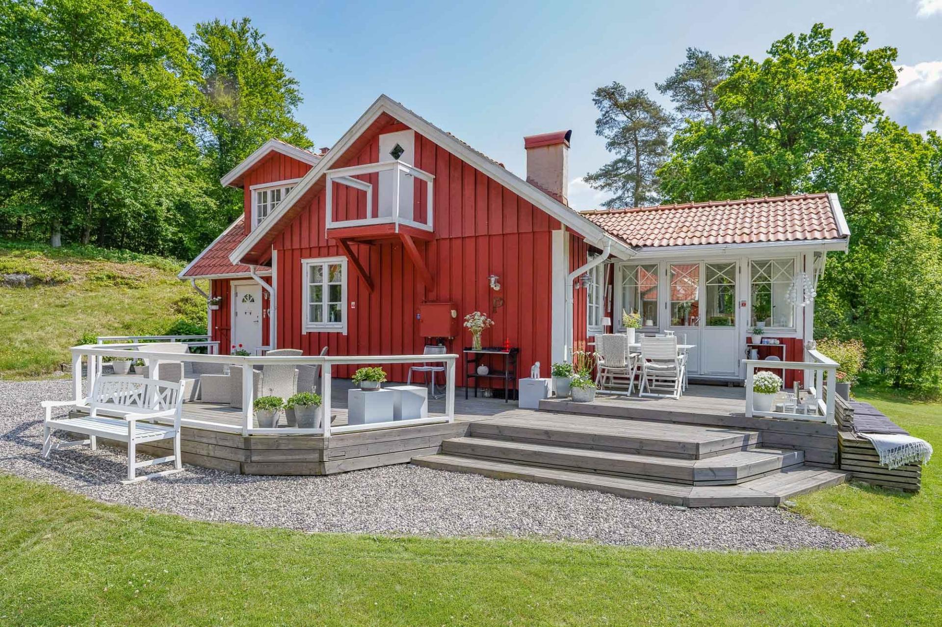 Den klassiskt rödvita fasaden smälter vackert in i omgivningen och skapar ett harmoniskt helhetsintryck – ett riktigt smultronställe för dig som söker lugn och livskvalitet. En glimt av Fylleån, som slingrar sig strax utanför,