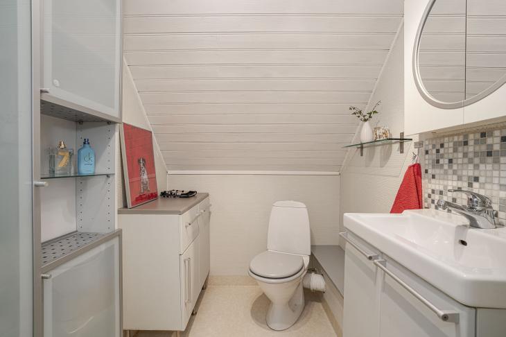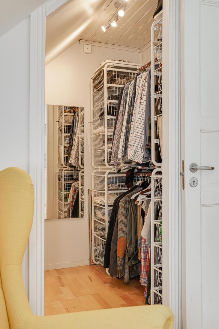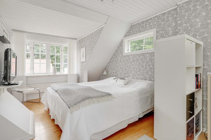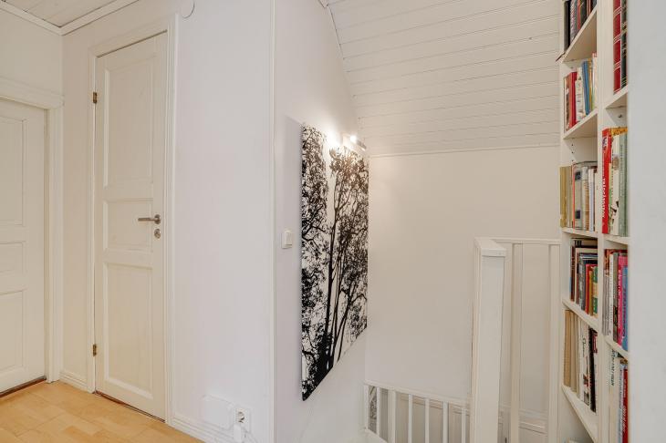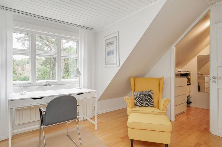 Här möts du av ett mysigt våningsplan med snedtak som skapar en ombonad och trivsam atmosfär.