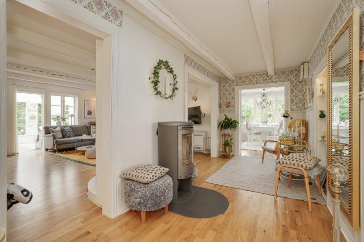 Boningshuset välkomnar med en rymlig och inbjudande hall som sätter tonen för hemmets genomtänkta planlösning. Det generösa vardagsrummet utgör husets hjärta, där stora fönsterpartier ramar in naturen som en levande tavla. Under årets kallare dagar sprider eldstäderna både värme och en extra känsla av hemtrevnad.