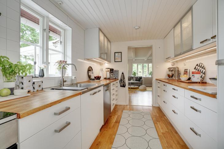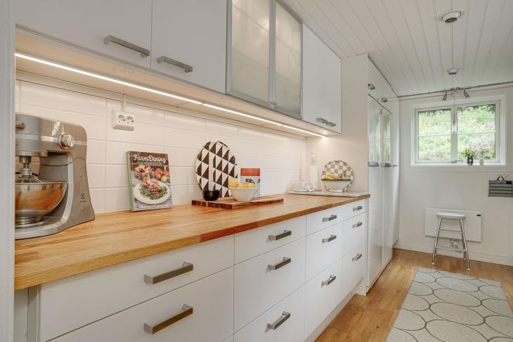 Välplanerat kök med stilren vit inredning och gott om förvaring i både skåp och lådor. Köket är utrustat med induktionshäll/ugn (2023), spisfläkt, , kyl, frys samt diskmaskin. Infällda spotlights i överskåp samt tak.